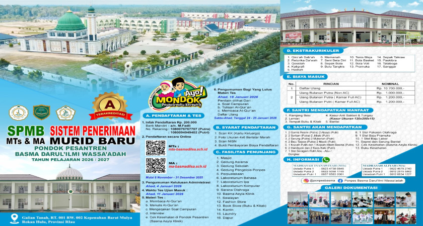 MTs Basma Darul’ilmi Wassa’adah Membuka Penerimaan Peserta Didik Baru Tahun Pelajaran 2026/2027